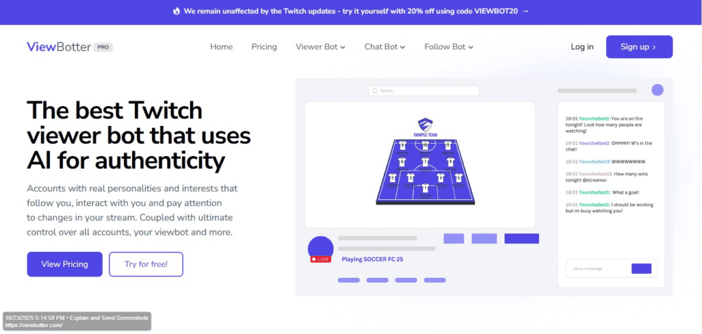 Viewbotter helps increase your live viewer count on Twitch, mainly by using a viewer bot. Streamers use it to make their streams look more popular and boost visibility fast. However, these viewers are not real or active, which means they don’t help build real engagement. It can give your stream a quick boost, but it also comes with risks since Twitch doesn’t allow bot viewers. While Viewbotter can make your numbers look good for a while, it’s not a safe or lasting way to grow your Twitch channel.